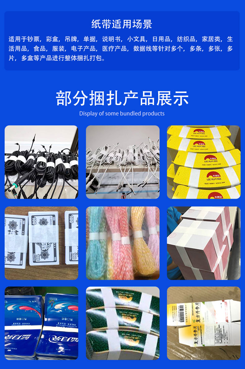 主要用于鈔票、彩盒、吊牌、單據(jù)、卡紙、書籍、報刊、小文具、制藥、食品、印刷品、服裝、旅游產(chǎn)品、金融產(chǎn)品、IT、日用化工產(chǎn)品等對較大較多的產(chǎn)品進行整體打包,也可對多片、多條、多根、多盒的較小硬、軟質(zhì)產(chǎn)品進行整體打包。