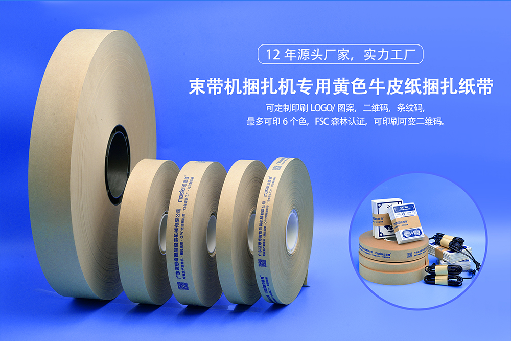 束帶機(jī)使用的捆扎帶有膜帶和紙帶兩種材質(zhì)的耗材,多種顏色可供用戶選擇,同時(shí)皆可根據(jù)用戶需求個(gè)性化印刷和定制。兩種扎帶的區(qū)別在于:膜帶成份復(fù)雜,成本高;紙帶環(huán)??山到?,成本低;同時(shí)要求扎帶強(qiáng)度高、拉力大、扛濕防潮的用戶可選擇膜帶,其余用戶可選擇紙帶。